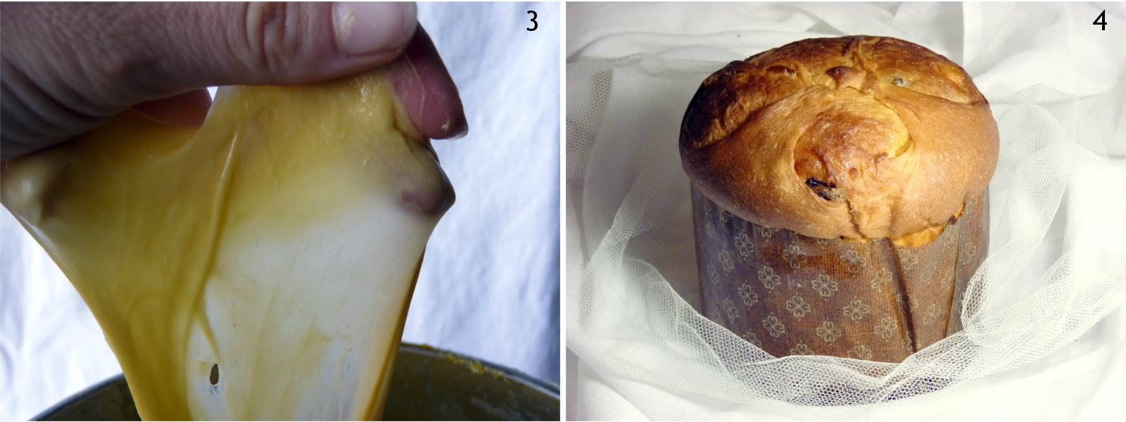 Ma...non è che vada sempre tutto liscio. Nelle foto 1 e 2, la tragica perdita di un impasto non incordato, che è poi diventato un plumcake (non sia mai che butto un kg e mezzo di roba buona!). Nelle ultime due, un bel velo e il panettone che ne è risultato!!!